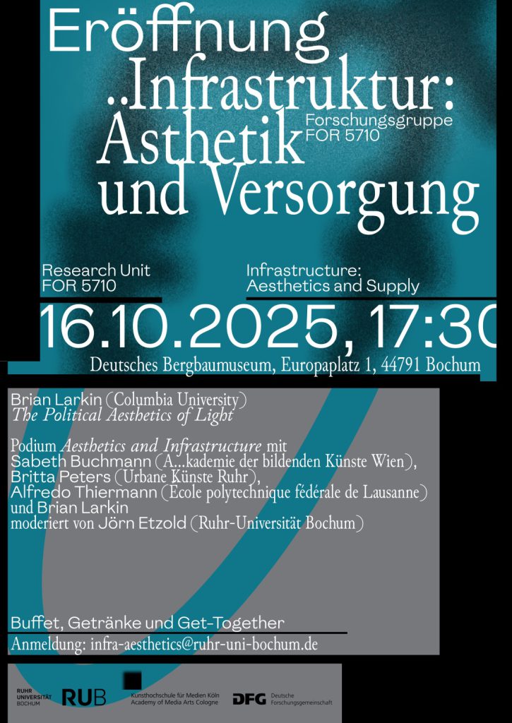 Die Forschungsgruppe wird mit einer Abendveranstaltung am 16.10.2025 ab 17:30 Uhr im Bergbaumuseum Bochum offiziell eröffnet. Den Eröffnungsvortrag hält Brian Larkin (Columbia University); es folgt eine Podiumsdiskussion zum Thema „Aesthetics & Infrastructure“ mit Sabeth Buchmann (Akademie der bildenden Künste Wien), Britta Peters (Urbane Künste Ruhr), Alfredo Thiemann (Ecole polytechnique fédérale de Lausanne) und Brian Larkin, moderiert von Jörn Etzold (Ruhr-Universität Bochum, Sprecher der Forschungsgruppe).
