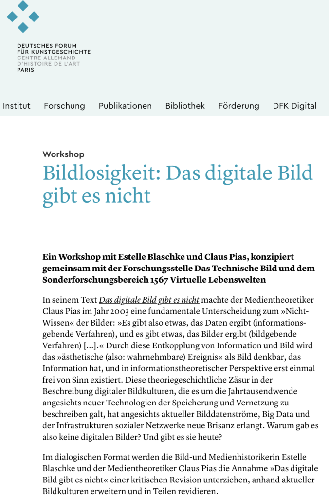 - SFB-Workshop: Bildlosigkeit (III): Das digitale Bild gibt es nicht (mit Estelle Blaschke und Claus Pias) || ausgerichtet von TP Virtuelle Bildarchive (Simon Rothöhler), TP Virtuelle Environments (Florian Sprenger) & Forschungsstelle Das Technische Bild, HU Berlin (Katja Müller-Helle) | 07. November 2025 | Deutsches Forum für Kunstgeschichte, Paris (Peter Geimer)